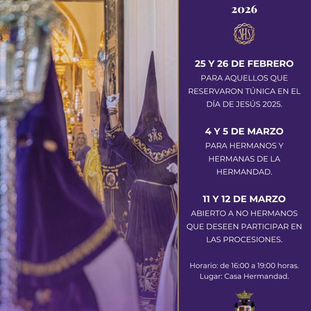 Se acerca el momento de volver a vestirnos de tradición, devoción y sentimiento morado. Un año más, iniciamos el reparto de túnicas 2026 para todas aquellas personas que deseen acompañar a...