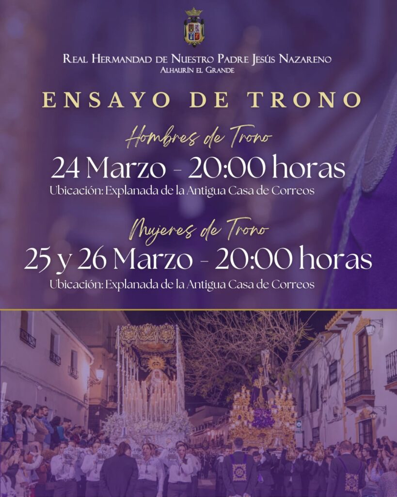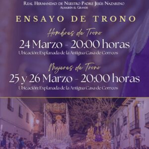 Las comisiones de tronos de nuestros Sagrados Titulares preparan con dedicación y entrega los Ensayos de Trono, un paso fundamental en el camino hacia nuestra Semana Santa. 🟣 Hombres de Trono 📅...