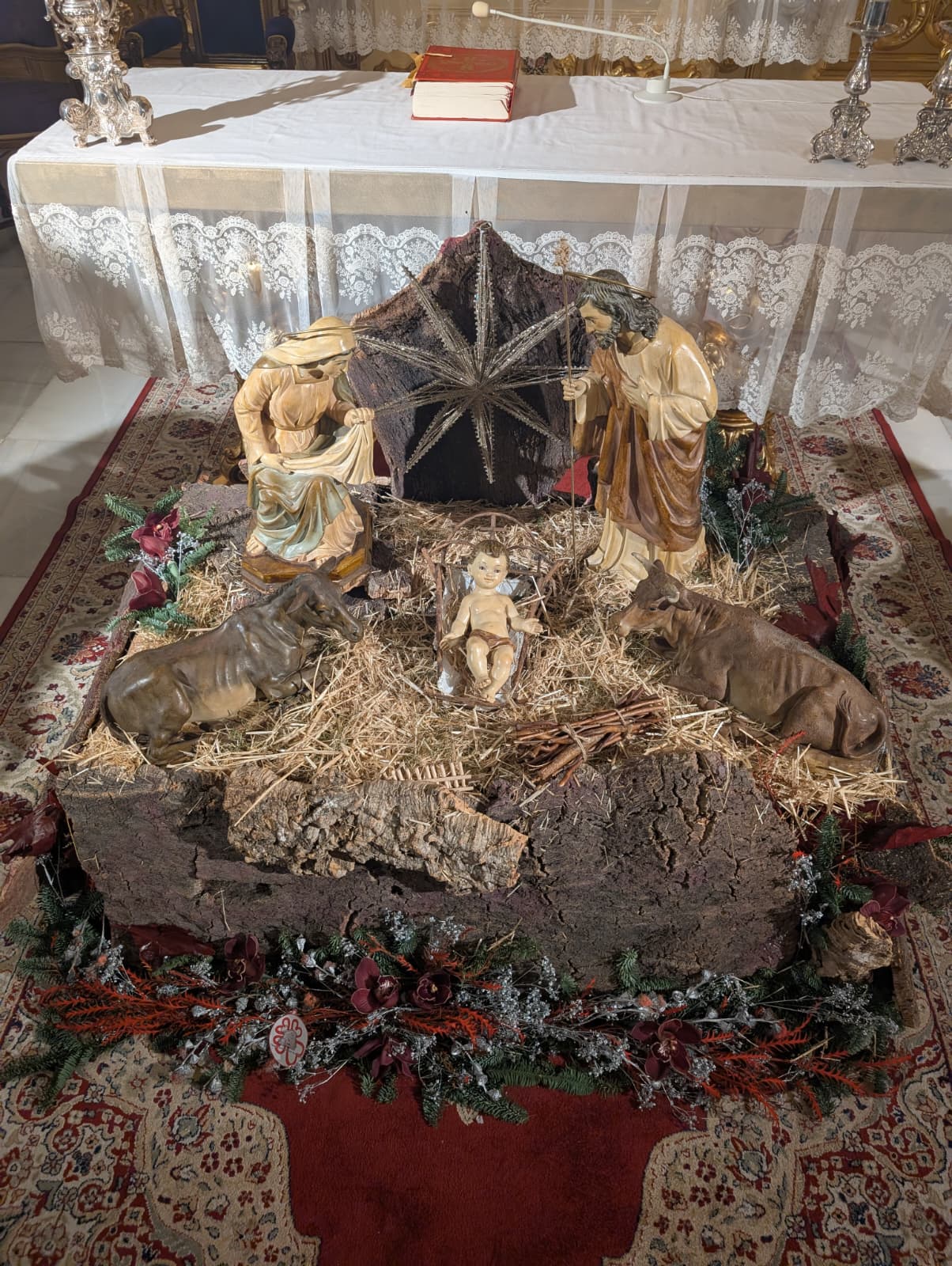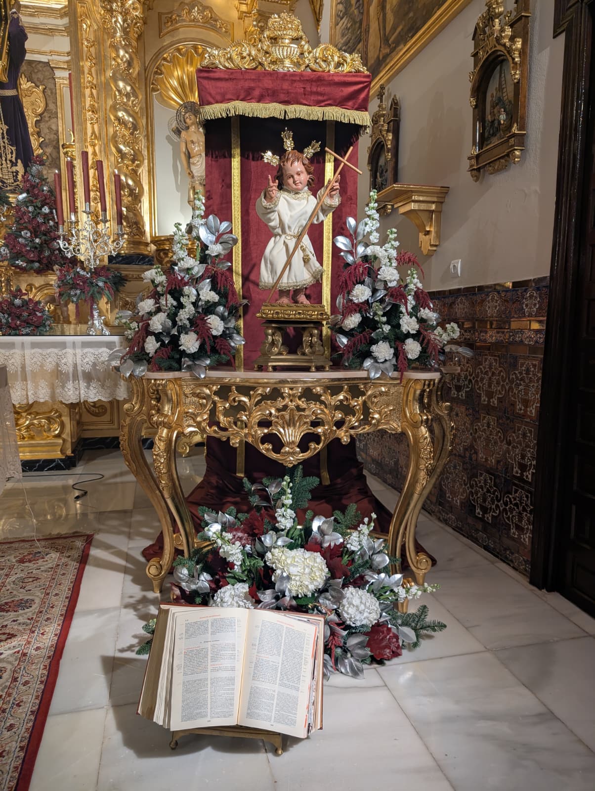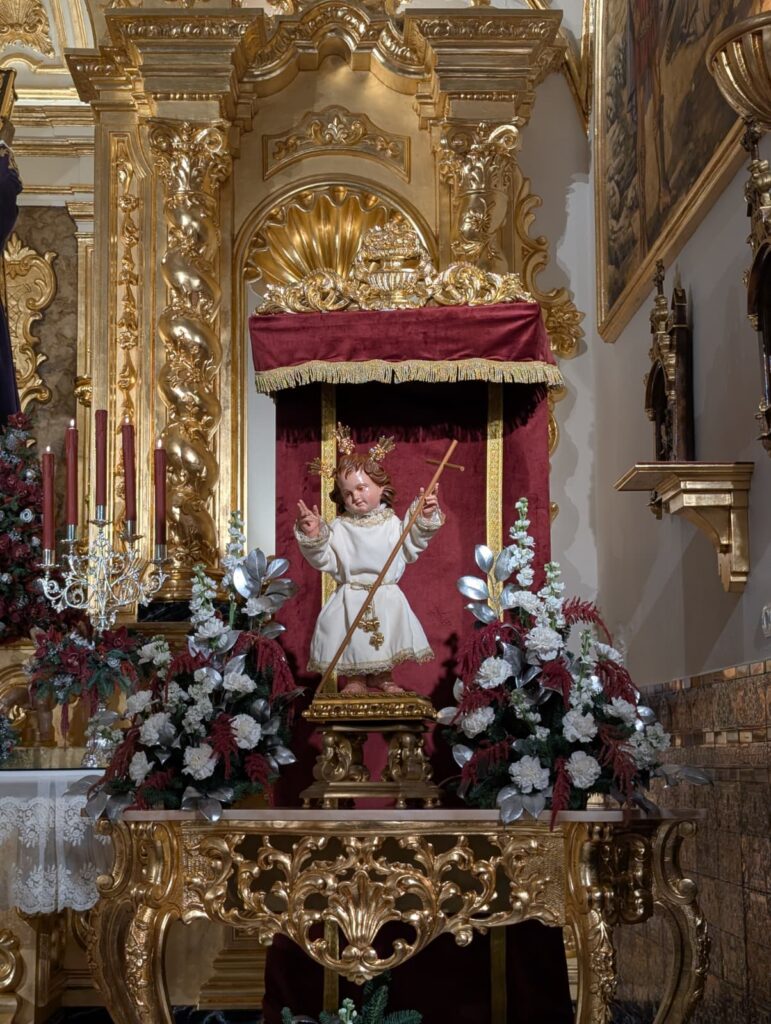 En la zona lateral derecha del presbiterio, la Sagrada Imagen del Dulce Nombre de Jesús centraba todas las miradas, elegantemente dispuesta bajo un dosel de palio burdeos que realzaba su divina presencia. El conjunto iconográfico se completaba con el Portal de Belén situado frente al altar y el Estandarte Mayor de la Hermandad a la izquierda. Todo el espacio fue embellecido con un exorno floral exquisito, compuesto por flores rojas entrelazadas con rosas blancas y matices plateados.