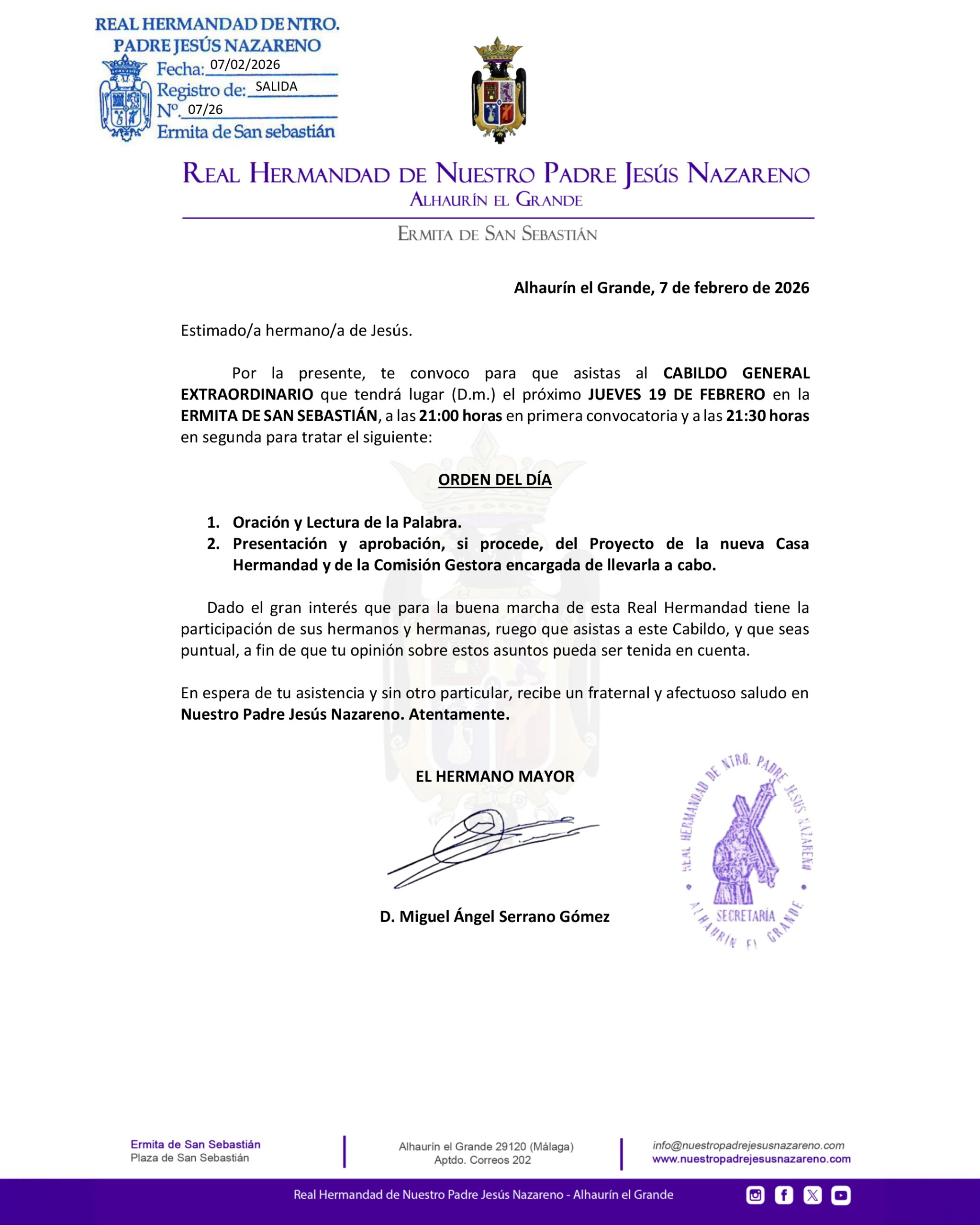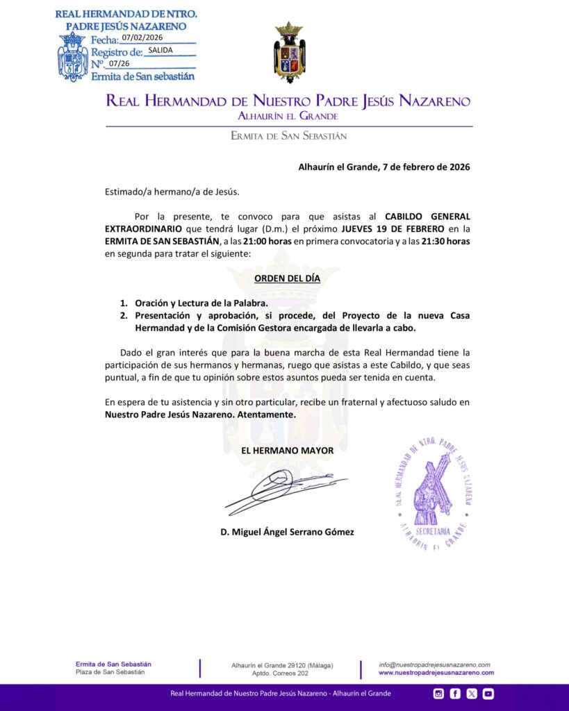 El próximo jueves 19 de febrero, los hermanos y hermanas de Jesús están convocados a Cabildo General Extraordinario en la Ermita de San Sebastián, a las 21:00 horas en primera convocatoria y a las 21:30 horas en segunda.