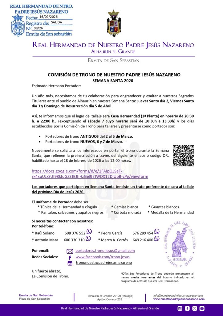 La Comisión de Trono de Nuestro Padre Jesús Nazareno informa que se encuentra abierto el plazo de preinscripción para todos los hermanos interesados en participar como portadores durante la Semana Santa 2026, en las salidas procesionales del Jueves Santo 2 de abril, Viernes Santo 3 de abril y Domingo de Resurrección 5 de abril.