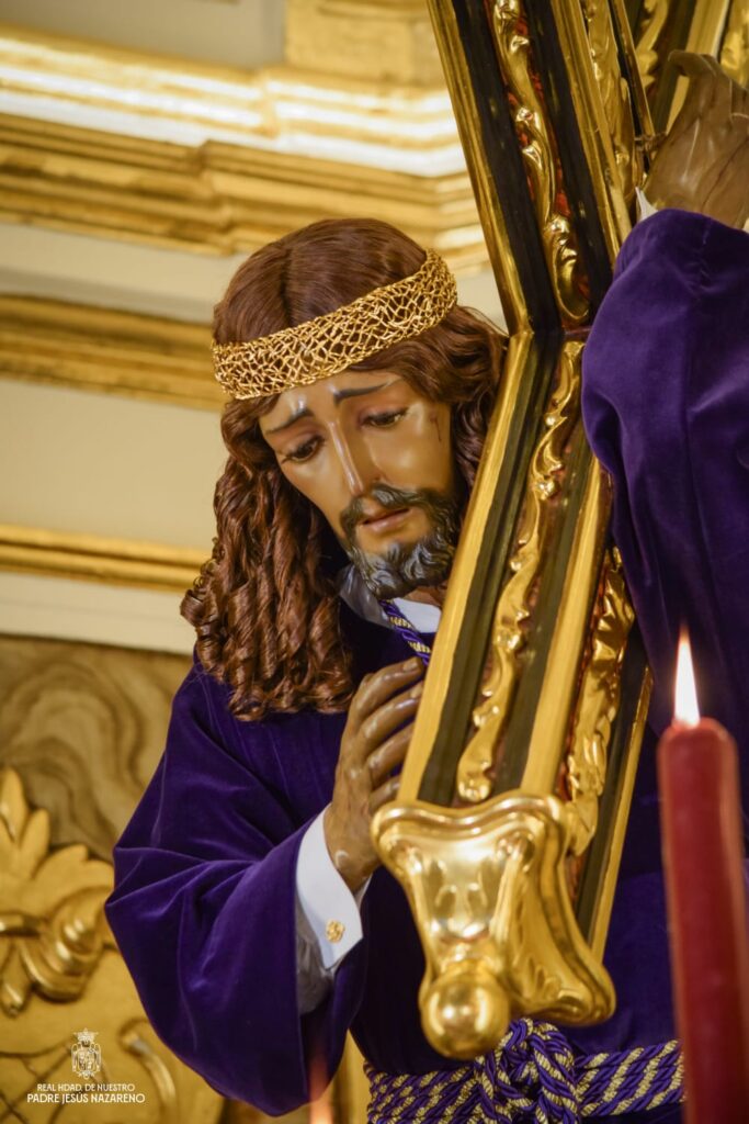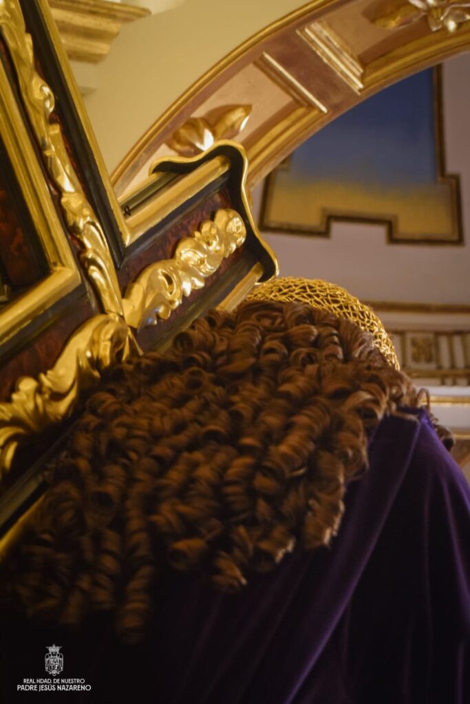 Así luce Nuestro Padre Jesús Nazareno en su camarín, revestido con la túnica lisa de terciopelo morado y la corona de turbante que portará durante el tiempo penitencial de la Cuaresma, reflejando sobriedad, recogimiento y humildad.
