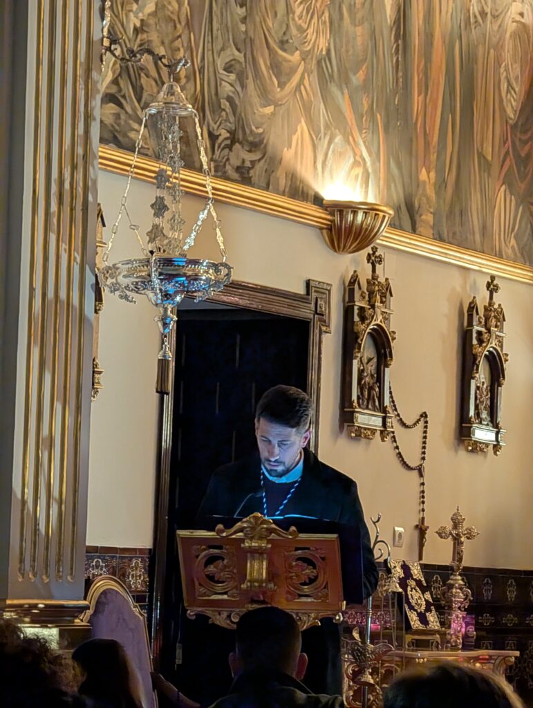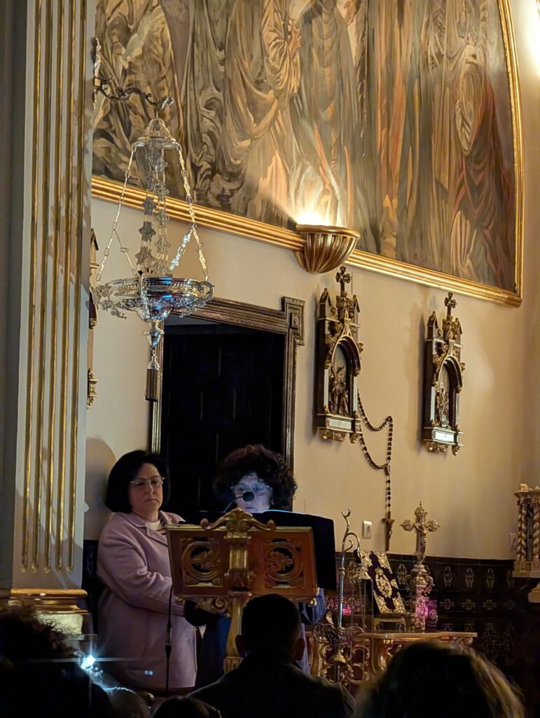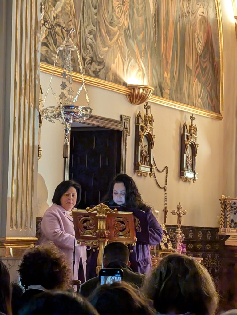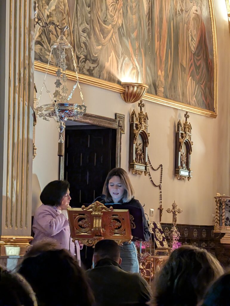 Seguidamente, se rezaron las estaciones del Vía Crucis, organizado por la Comisión de Liturgia, en el que, en cada estación, se encendió una vela a los pies de la Cruz de Jerusalén que custodia la reliquia del Monte Calvario, generando un ambiente de silencio, reflexión y oración compartida. El rezo de las estaciones estuvo acompañado musicalmente por Ronald López, a quien le acompañó la joven hermana Blanca Manzanares, junto a su padre, Juan Manuel Manzanares, a la guitarra.
