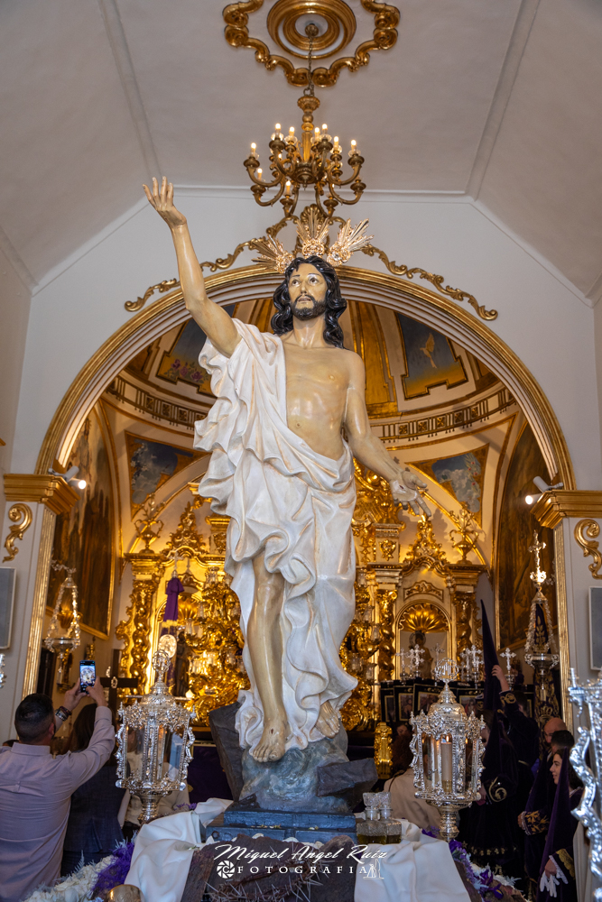En la entrada, la imponente imagen de Nuestro Padre Jesús Resucitado entronizado daba la bienvenida con un exorno floral en tonos blancos que simbolizaban la pureza y la vida de la Resurrección de nuestro señor.