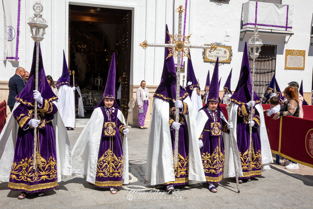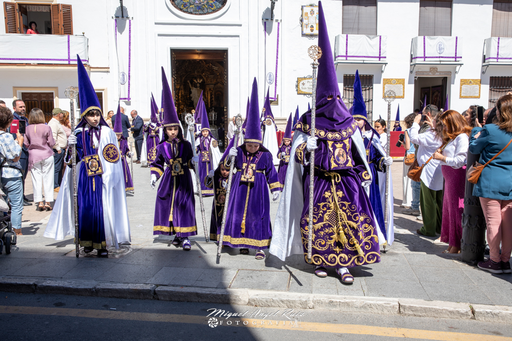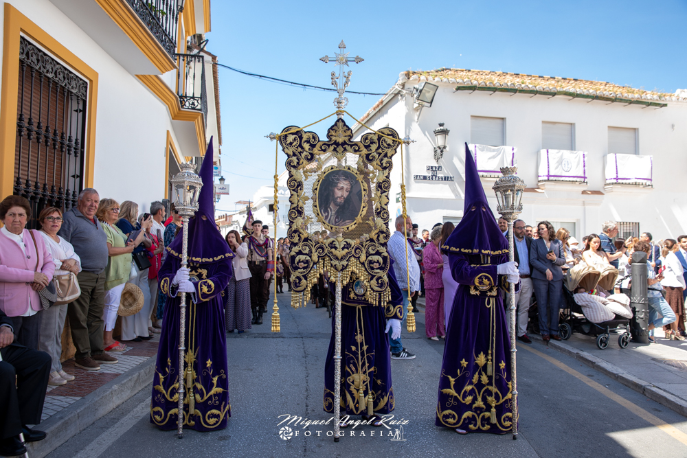 Un amplio cortejo de nazarenos moraos inundaba las calles de nuestro pueblo, a su vez abarrotadas de vecinos, vecinas y hermanos y hermanas en Jesús Nazareno, que esperaban con alegría la llegada de la procesión.