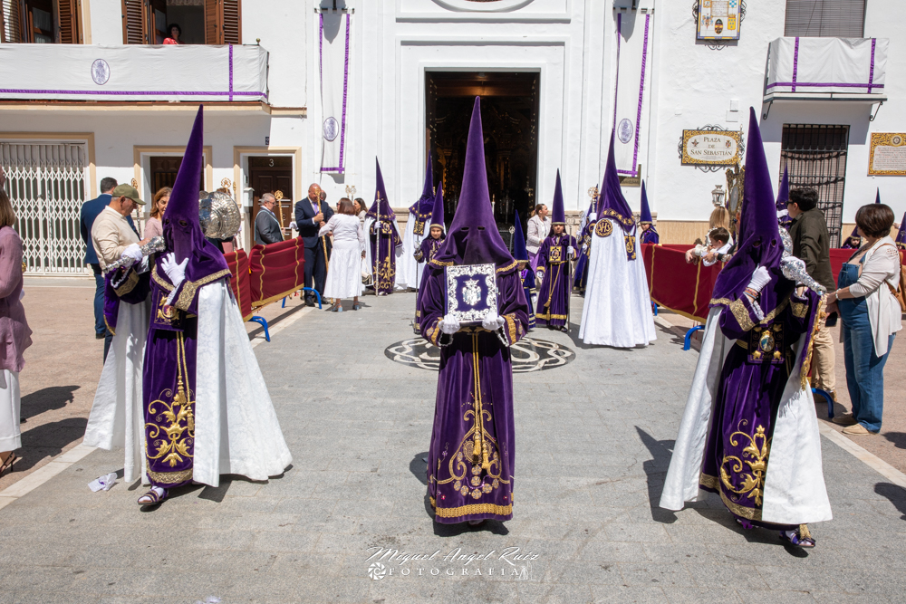 Tras la finalización de la Eucaristía de Resurrección, se abrieron las puertas de la Ermita de San Sebastián para el comienzo del Cortejo Procesional. Nuestra Ermita resplandecía bajo un sol radiante que nos ha acompañado durante toda la Semana Santa.