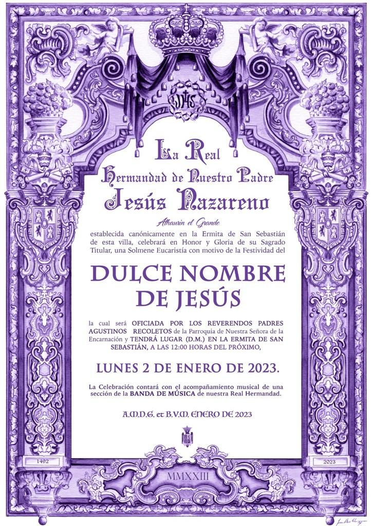 Nuestra Real Hermandad empezaba 2023 con la celebración, el lunes 2 de enero, de la Solemne Eucaristía la “Festividad del Dulce Nombre de Jesús”, festividad que se viene celebrando desde 1721 cuando el Papa Inocencio VI la establece como fiesta para todo la...