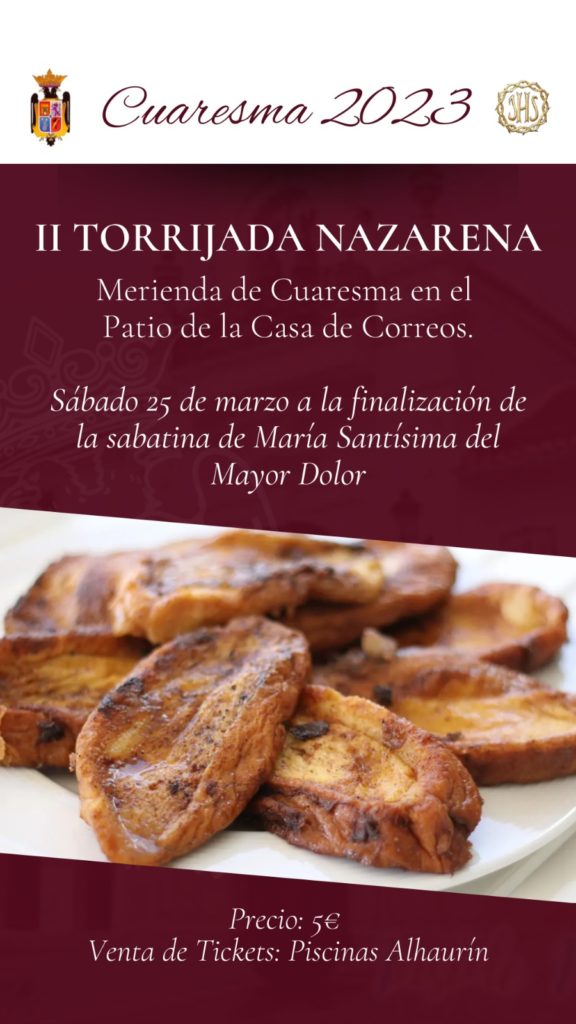 El próximo sábado 25 de marzo tendrá lugar la II Torrijada Nazarena en el patio de la Antigua Casa de Correos, a la finalización de la sabatina de María Santísima del Mayor Dolor, para todos aquellos hermanos y vecinos que quieran asistir. Las personas interesadas...