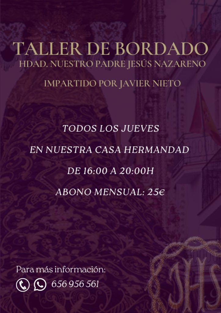 La Real Hermandad de Nuestro Padre Jesús Nazareno pone en marcha el nuevo curso de bordado en oro impartido por, D. Javier Nieto. Dicho taller, está destinado a todas las personas con interés en aprender o reforzar sus conocimientos en este arte centenario del...