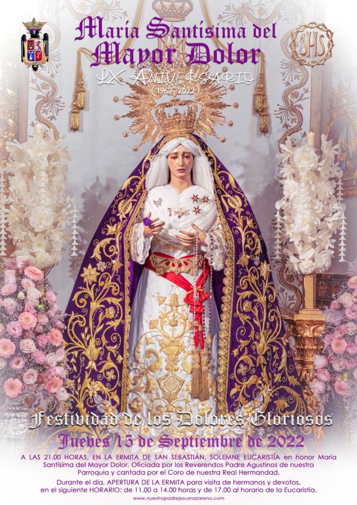 El próximo jueves 15 de septiembre, a las 21.00 horas, la Ermita de San Sebastián acogerá la Solemne Eucaristía que se celebra con motivo de la Festividad de los Dolores Gloriosos de la Virgen, en honor a nuestra Sagrada Titular, María Santísima del Mayor Dolor. La...