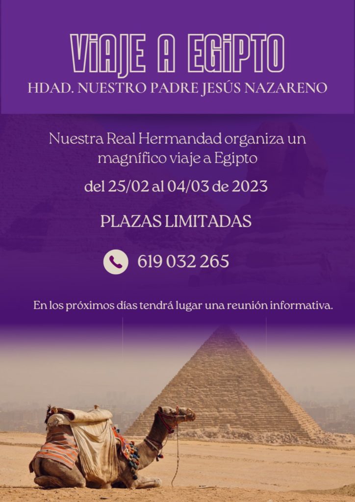 La Real Hermandad de Nuestro Padre Jesús Nazareno, organiza un magnífico viaje a Egipto, que tendrá lugar desde el 25 de febrero al 4 de marzo de 2023. En dicho viaje, visitaremos todas las maravillas que ofrece el pais de los faraones, así como su capital, El...