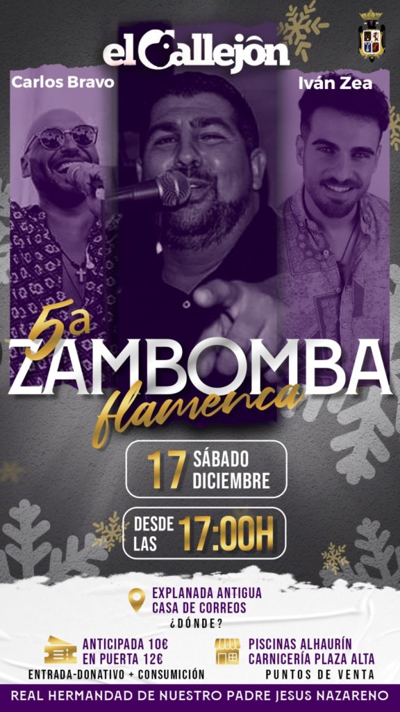 El sábado 17 de diciembre, desde la 17:00 horas, la explanada de la Antigua Casa de Correos acogerá la V Zambomba Flamenca de nuestra Real Hermandad, un evento muy esperado por los hermanos y simpatizantes. En ella actuarán los artistas: "El Callejón", Carlos Bravo...