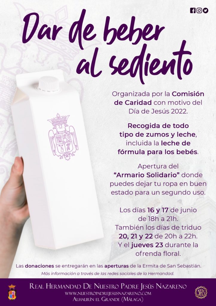 La Comisión de Caridad con motivo de nuestra Festividad de Gloria organiza una campaña solidaria para los más necesitados. “Dar de beber al sediento”, en la que se puede colaborar con tipo de zumos y leche, incluida leche de fórmula para bebés; y “Armario...