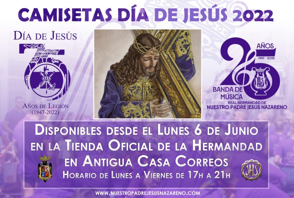 Desde hoy lunes 6 de junio los hermanos, las hermanas y simpatizantes que así lo deseen podrán obtener su camiseta para el “Día de Jesús 2022” en nuestra tienda oficial en la Antigua Casa de Correos en horario de 17.00 a 21 horas. La camiseta oficial de la...