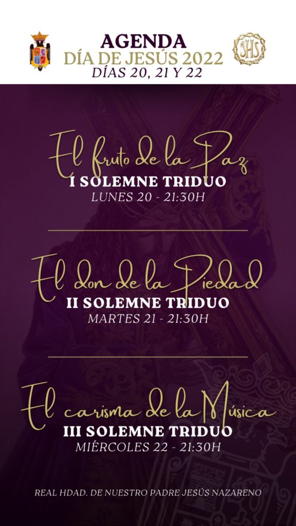 La semana de la Festividad de Gloria en Honor a Nuestro Padre Jesús Nazareno, nuestro anhelado y esperado Día de Jesús 2022, empezaba con el Triduo en la Ermita de San Sebastián, bajo el lema “Ven Espíritu Santo” para renovar los frutos, los dones y las gracias que...