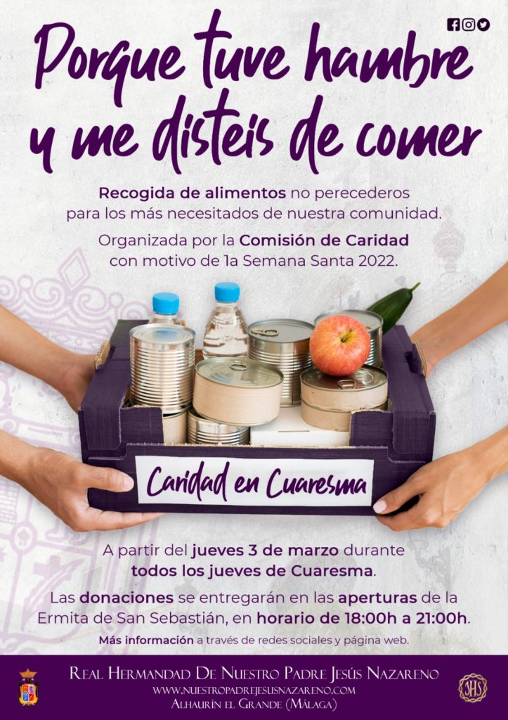 Desde este jueves 3 de marzo y hasta le jueves 31 de marzo tendrá lugar en la Ermita de San Sebastián en horario de 18.00 horas a 21.00 horas los “Jueves de Caridad” en Cuaresma, que en esta ocasión llevan por título “Porque tuve hambre y me distéis de comer”. La...