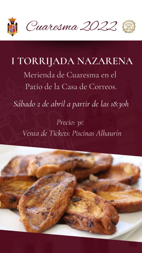 El próximo sábado 2 abril tendrá lugar la I Torrijada Nazarena en el patio de la Antigua Casa de Correos a partir de las 18.30 horas para todos aquellos hermanos y vecinos que quieran asistir. Las personas interesadas podrán adquirir su ticket a un precio de 3...