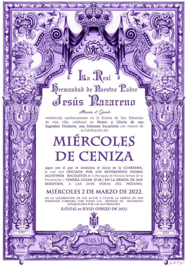 Mañana, miércoles 2 de marzo comienza la Cuaresma con la celebración del Miércoles de Ceniza. Con este motivo la Ermita de San Sebastián, a las 20.00 horas, acogerá la denominada “Misa de Imposición de Cenizas”, oficiada por los Reverendos Padres Agustinos...