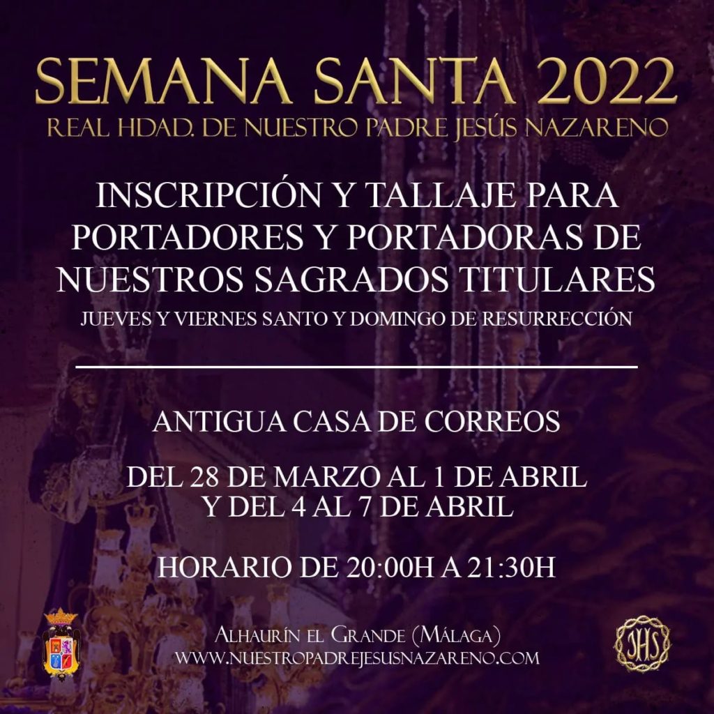 Las Comisiones de Trono de Nuestro Padre Jesús Nazareno y María Santísima del Mayor Dolor comenzarán el próximo lunes 28 de marzo con la inscripción y tallaje de los portadores y portadoras de nuestros Sagrados Titulares para la Semana Santa 2022. Dicho evento...