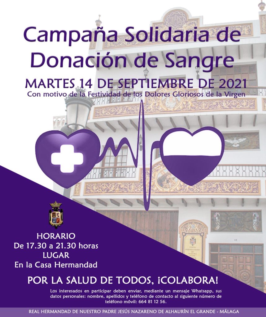 Con motivo de la Festividad de los Dolores Gloriosos de la Virgen, en honor a nuestra Sagrada Titular, María Santísima del Mayor Dolor, nuestra Real Hermandad organiza el martes 14 de septiembre la Campaña Solidaria de Donación de Sangre en colaboración con el...
