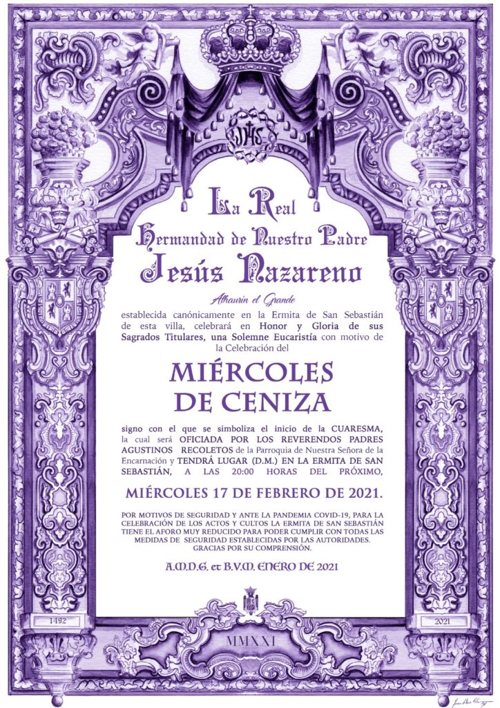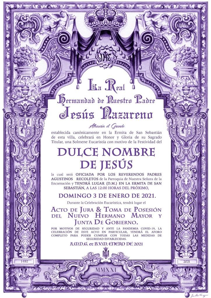 El próximo domingo 3 de enero, la Ermita de San Sebastián acogerá, a las 12.00 horas la Solemne Eucaristía en Honor y Gloria de Nuestro Padre Jesús Nazareno con motivo de la Festividad del Dulce Nombre de Jesús y el Acto de Jura y Toma de Posesión del nuevo Hermano...
