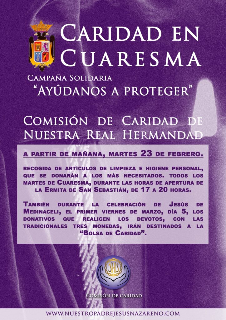 La Comisión de Caridad de Nuestra Real Hermandad inicia, a partir de mañana, martes 23 de febrero, “Caridad en Cuaresma” bajo el lema, “Ayúdenos a proteger”. La campaña consiste en la recogida de artículos de limpieza e higiene personal, que se donarán a los más...