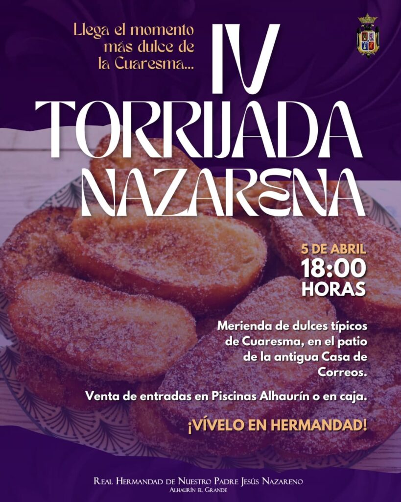 El próximo sábado 5 de abril tendrá lugar la IV Torrijada Nazarena en el patio de la Antigua Casa de Correos a partir de las 18:00 horas para todos aquellos hermanos y vecinos que quieran asistir. Las personas interesadas podrán adquirir su ticket a un precio de 5€...
