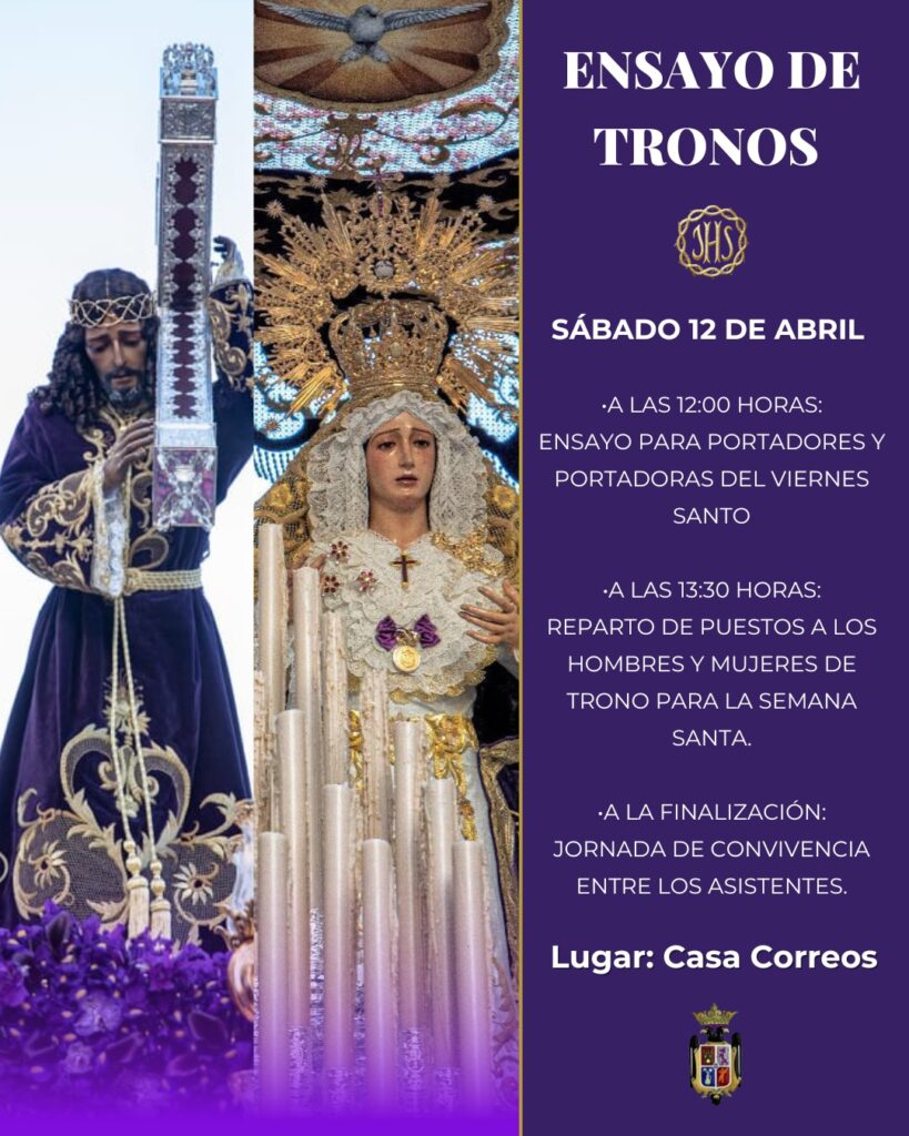 El próximo sábado las comisiones de trono de nuestros Sagrados Titulares han organizado un ensayo para los portadores y las portadoras del Viernes Santo a las 12 del mediodía. Seguidamente, a las 13:30 horas se realizará el reparto de tarjetas de sitio para los...