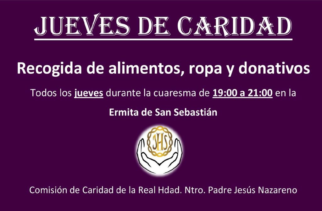 A partir del jueves 14 de marzo y durante todos los jueves de la Cuaresma dará comienzo los denominados “Jueves de Caridad” de Nuestra Real Hermandad. De 19.00 a 21.00 horas en la Ermita de San Sebastián, todos aquellos que lo deseen podrán colaborar aportando...