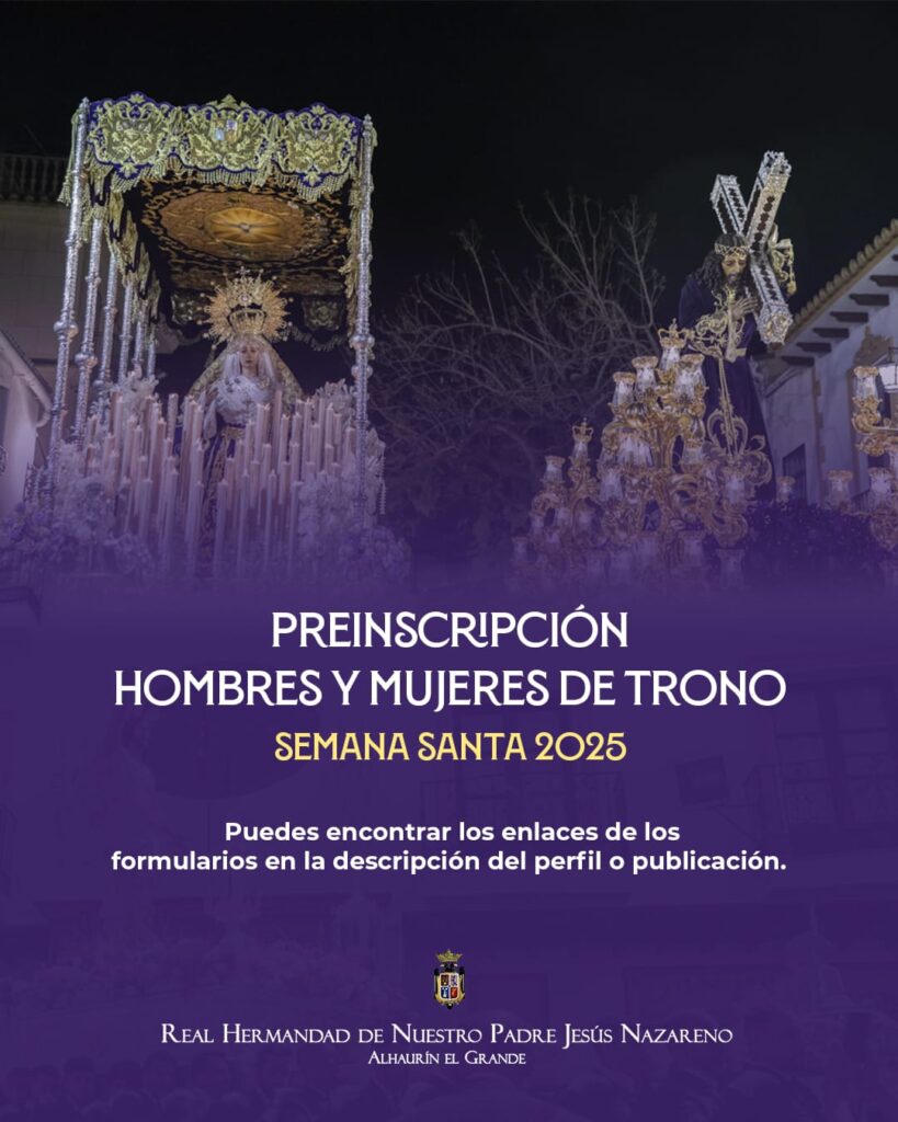 Estimados hermanos, hermanas y devotos, os dejamos aquí el formulario de preinscripción para todas las personas que deseen participar como HOMBRE o MUJER DE TRONO de nuestros Sagrados Titulares en la próxima Semana Santa. 👉🏼 𝗛𝗼𝗺𝗯𝗿𝗲 𝗱𝗲 𝗧𝗿𝗼𝗻𝗼 Rellénalo aquí:...
