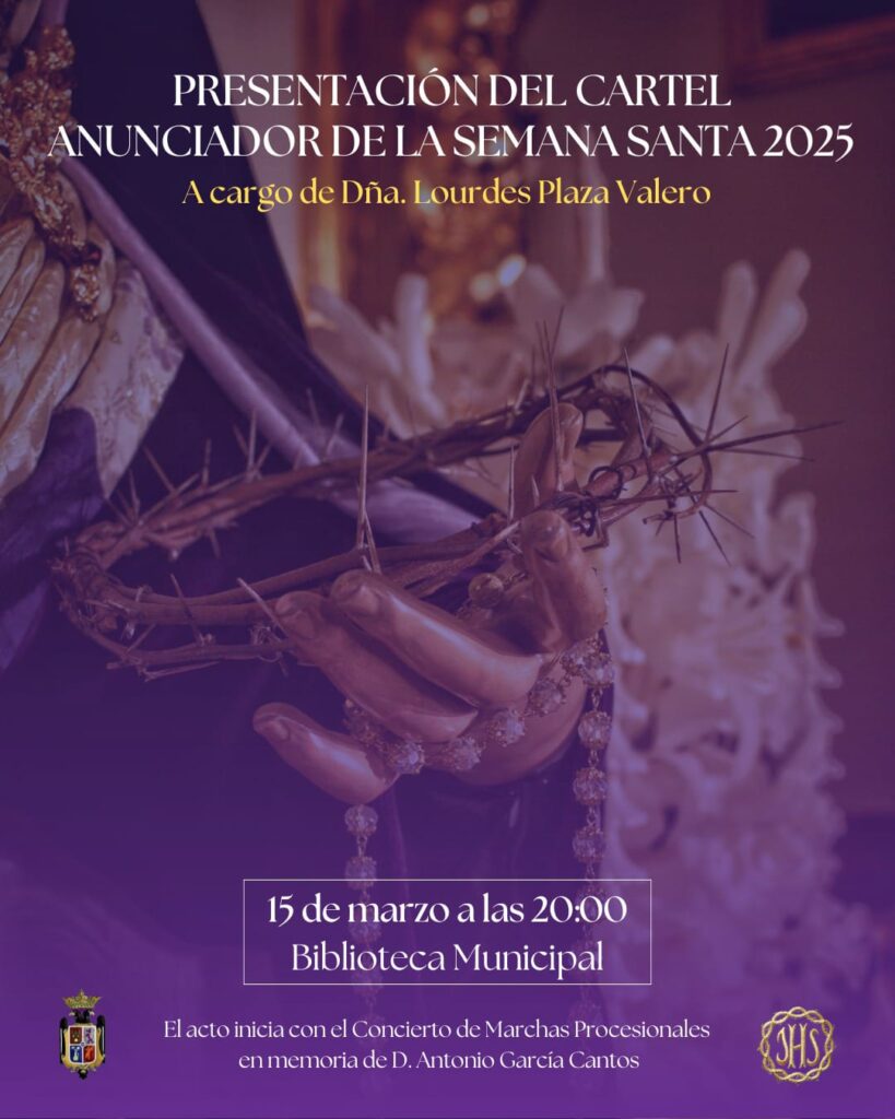 El próximo sábado 15 de marzo, a las 20:00 horas, el Salón de Actos de la Biblioteca Municipal acogerá la presentación del Cartel Anunciador de la Semana Santa 2025. El cartel, obra de nuestro hermano, D. Miguel Ángel Ruiz Badía, será presentado por Dña. Lourdes...