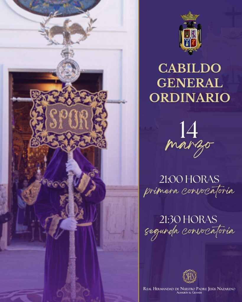 El próximo viernes 14 de marzo, los hermanos y hermanas de Jesús están convocados a Cabildo General Ordinario de Semana Santa en la Ermita de San Sebastián, a las 21:00 horas en primera convocatoria y a las 21:30 horas en segunda. Se ruega asistencia y puntualidad....