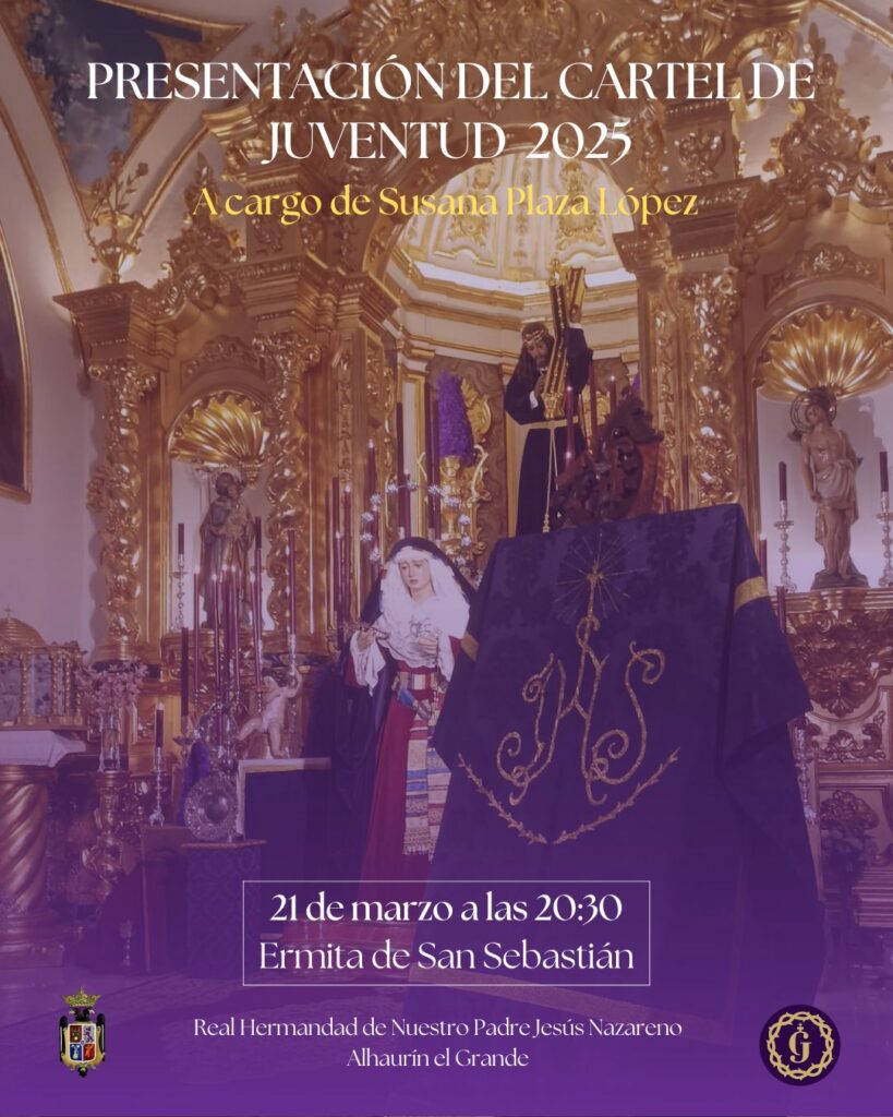 El próximo viernes 21 de marzo, la Ermita de San Sebastián acogerá la presentación del Cartel de la Juventud de la Semana Santa 2025. El cartel, obra de nuestra hermana, Ángela García Fernández, será presentado por la joven, Susana Plaza López, hermana de Jesús...