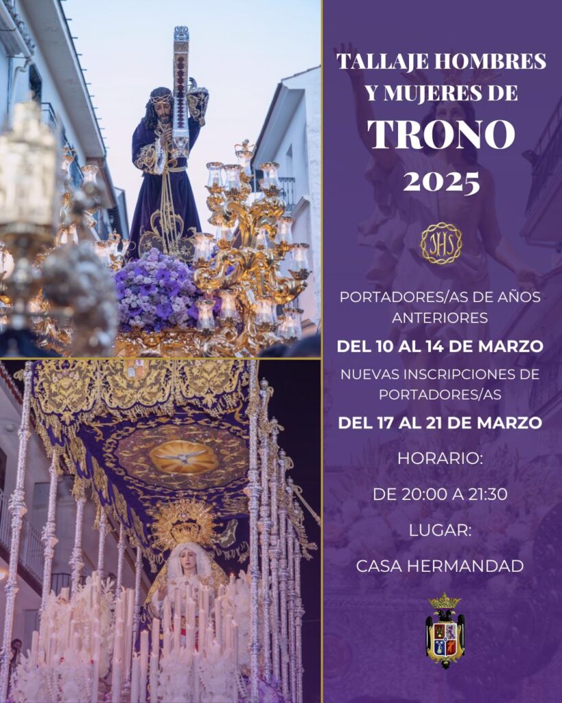 Informamos las fechas y horarios para el tallaje de los hombres y mujeres de trono de nuestros Sagrados Titulares para la Semana Santa 2025. 🟣 Portadores/as de años anteriores: Del 10 al 14 de marzo. 🟣 Nuevas inscripciones de portadores/as: Del 17 al 21 de marzo. 📍...