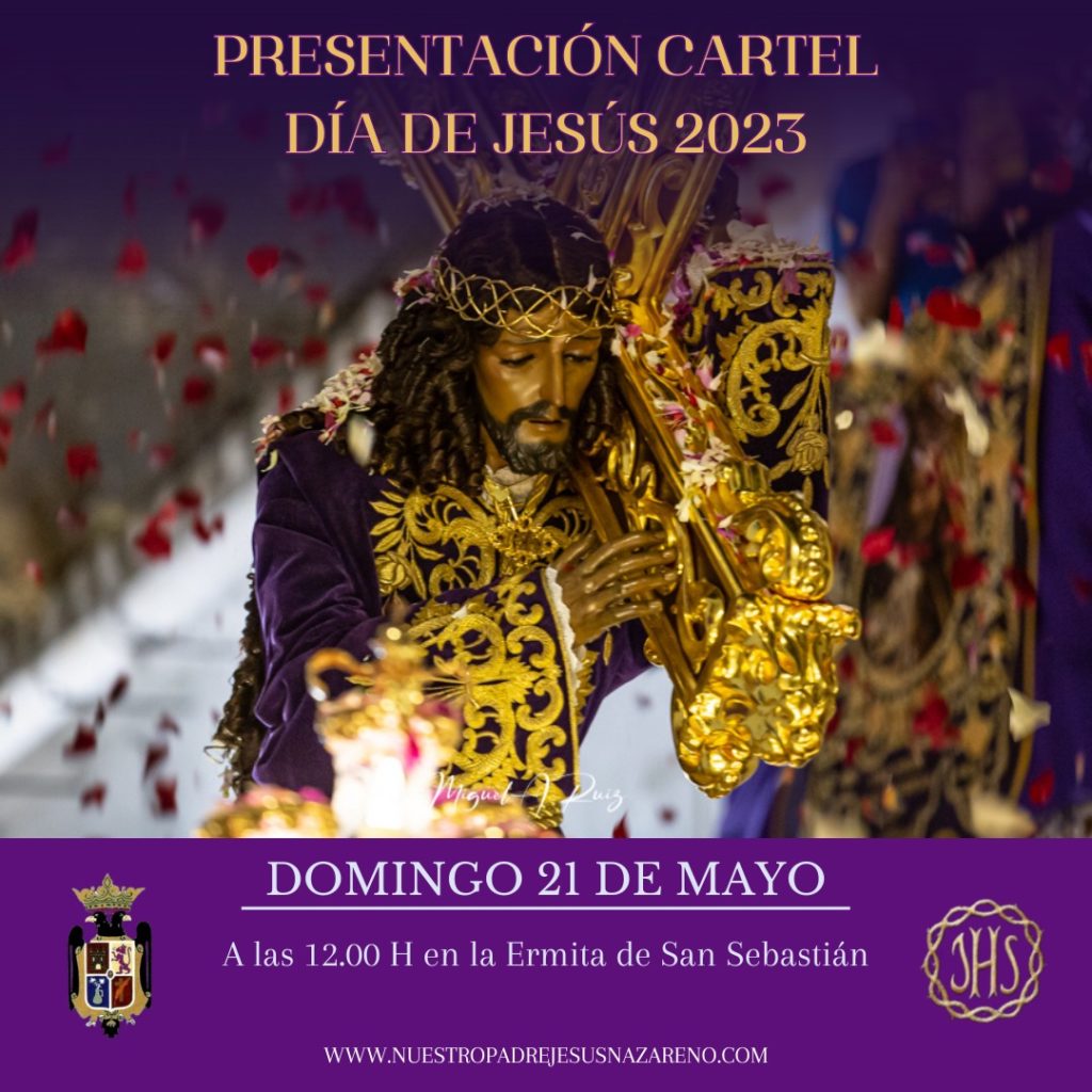 El próximo domingo 21 de mayo a las 12:00 h. en la Ermita de San Sebastián tendrá lugar la presentación del Cartel Anunciador del Día de Jesús 2023 a cargo del Teniente Coronel, y hermano, D. Alfonso Armada de Losada. El cartel ha sido realizado por el prestigioso...