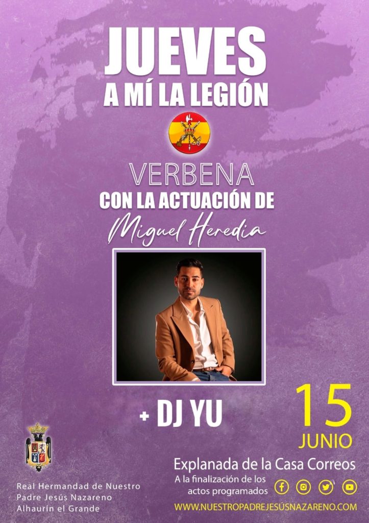 El próximo jueves 15 de junio, a la finalización de los actos programados en la Ermita de San Sebastián, tendrá lugar la Verbena "A mi la Legión" en la explanada de la Casa de Correos con la actuación de, Miguel Heredia y DJ Yull Fiction, Francisco Plaza Bravo...