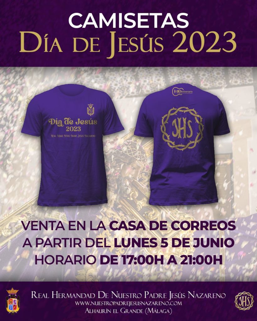 Desde el próximo lunes 5 de junio los hermanos, las hermanas y simpatizantes que así lo deseen podrán obtener su camiseta para el “Día de Jesús 2023” en nuestra tienda oficial en la Antigua Casa de Correos con un horario de 17:00 a 21:00 horas. La Camiseta Oficial...